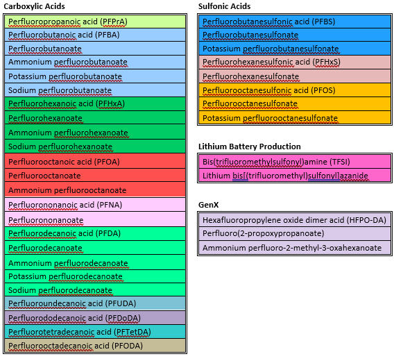 [2] 15 of the 16 distinct PFAS are included on the list of 40 analytes in Method 1633A. The category used in lithium batteries (indicated as TFSI) is not on the standard Method 1633A list.