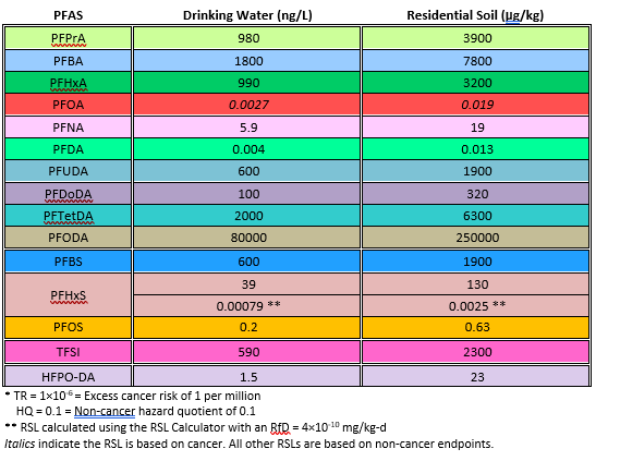 [3] The six PFAS in the November 2022 RSL table update – PFBS, PFOA, PFNA, PFOS, PFHxS, and GenX – were those included in the EPA’s April 2024 promulgation of PFAS drinking water standards, which per a May 2025 announcement will likely be revised.