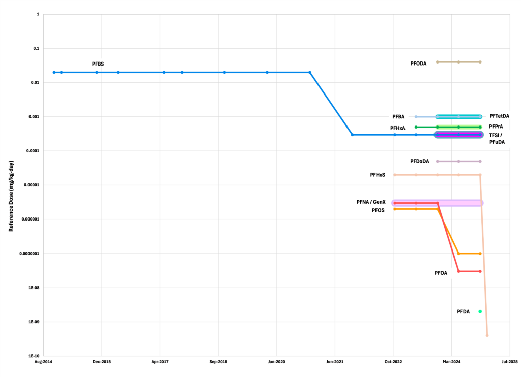 Despite a general dearth of studies, the EPA accelerated its efforts at developing risk assessment toxicity values from 2022 through early 2025. As indicated in Timeline 1’s depiction of non-cancer reference doses (RfDs), PFBS was first included in the RSL tables in November 2014, and it remained the only listed PFAS until PFOA, PFNA, PFOS, PFHxS, and GenX were added in November 2022.[3] Nine additional compounds were added through the November 2024 update.[4]